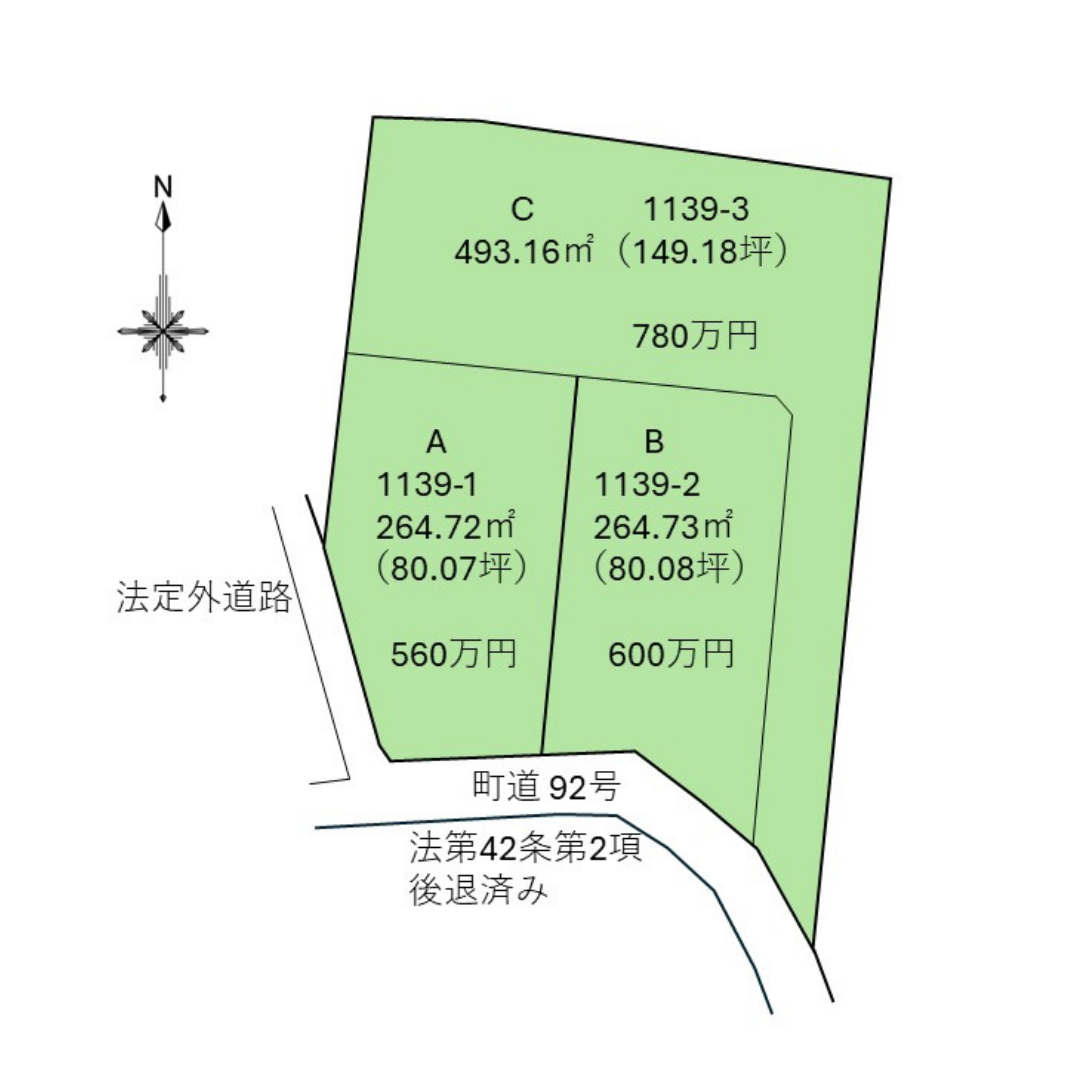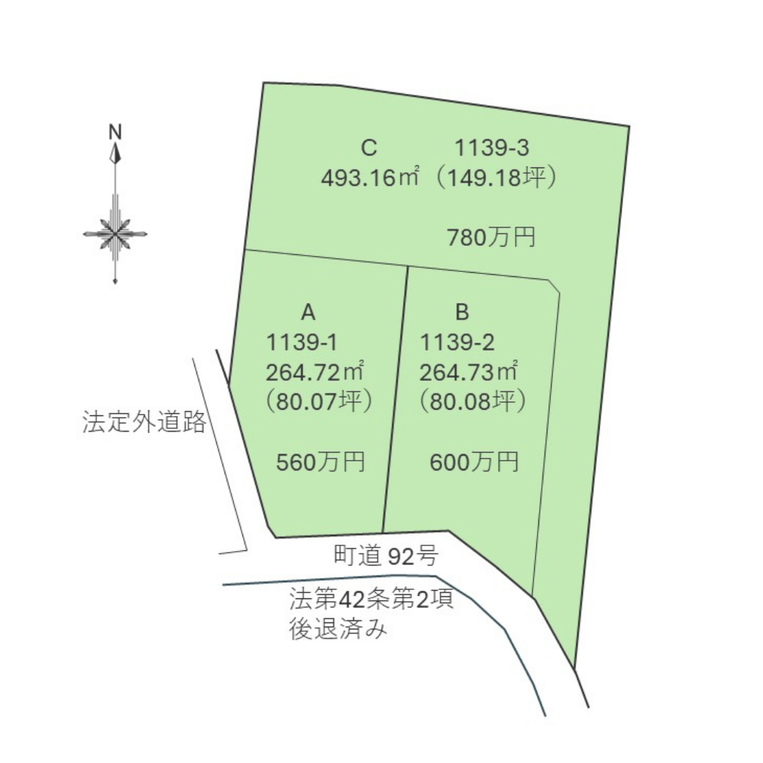 | 土地面積 | A:264.72㎡ B:264.73㎡ C:493.16㎡ (80.07坪) (80.08坪) (149.18坪) |